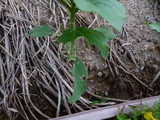 他に植えているひまわりですが、葉が葉脈だけのこして食べられまくりです。