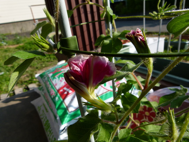 気温が低く、色が悪いアサガオ。ちょっと育ちが心配。
