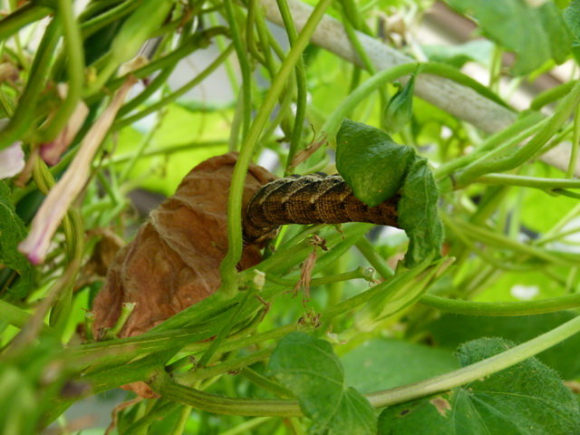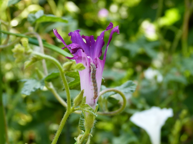 花を食べる芋虫と、バッタです。どうもバッタは、オンブバッタと以前書いたのですが、ショウリョウバッタのようです。