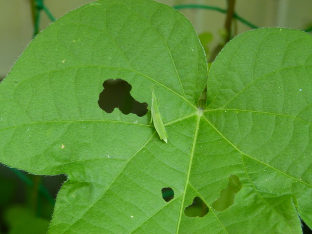 どうもよく見かける「オンブバッタ」が犯人(犯虫)らしいです。