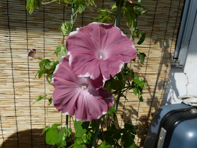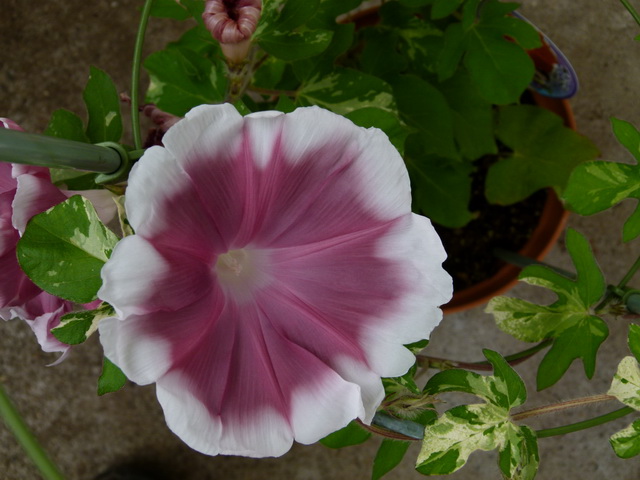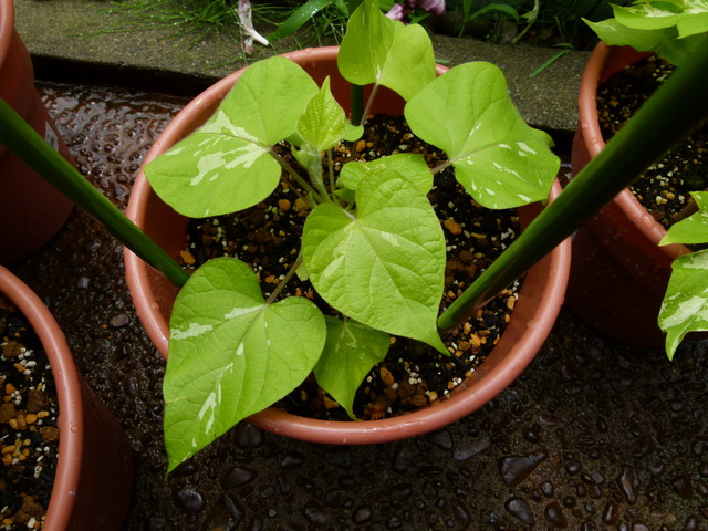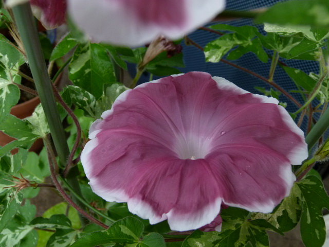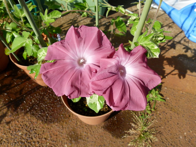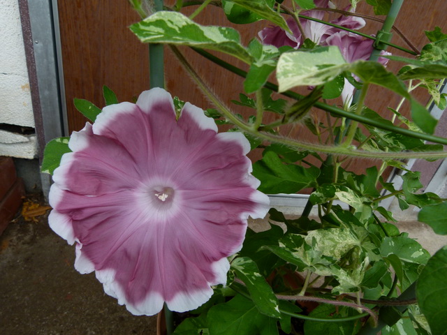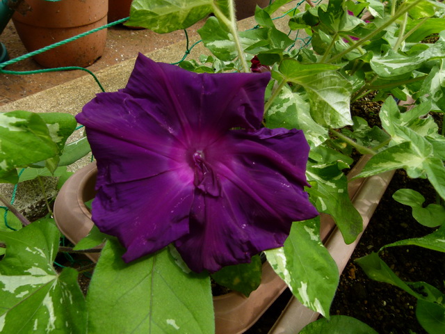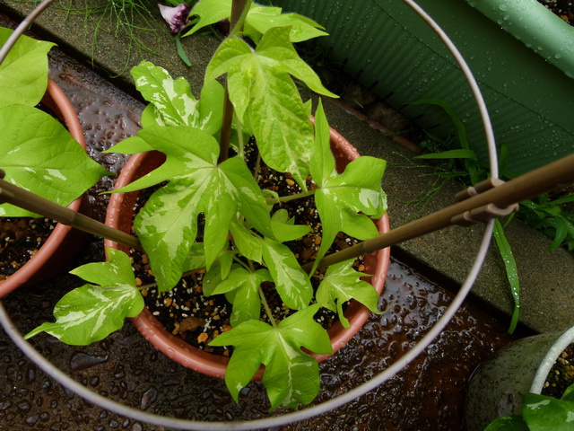 昨日から降っていたので、鉢植えのアサガオは、家の軒下に避難。